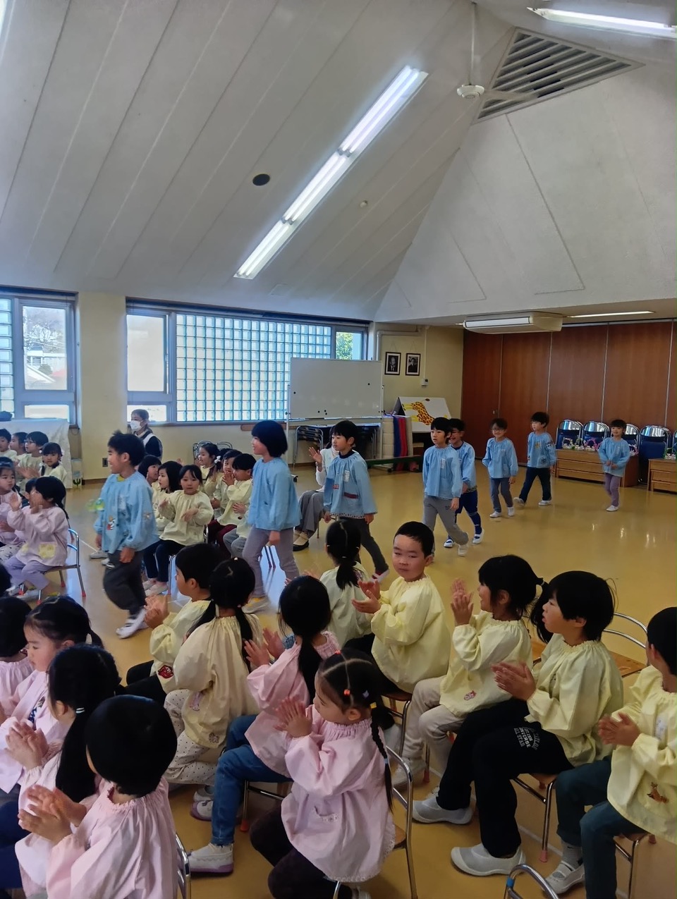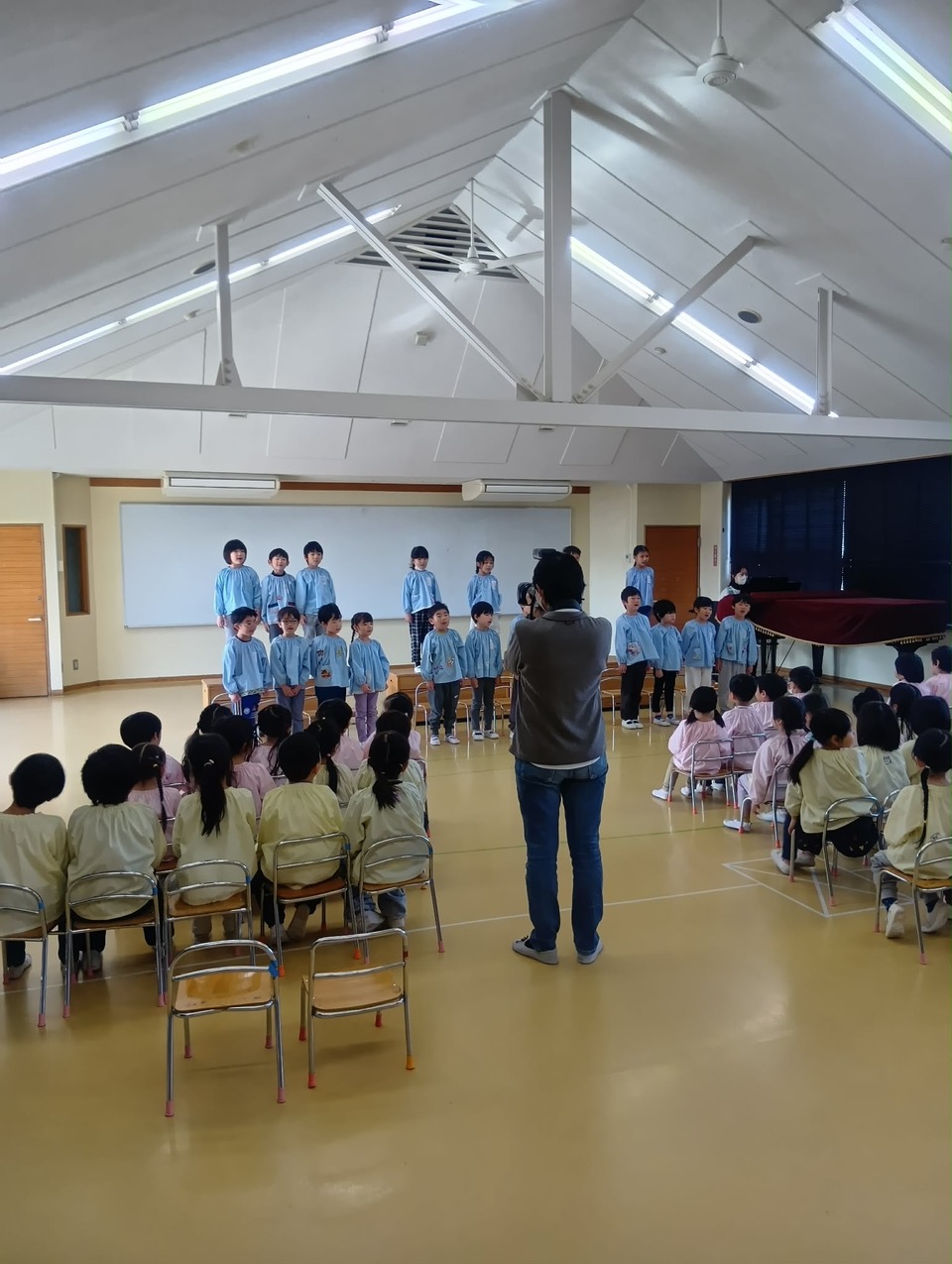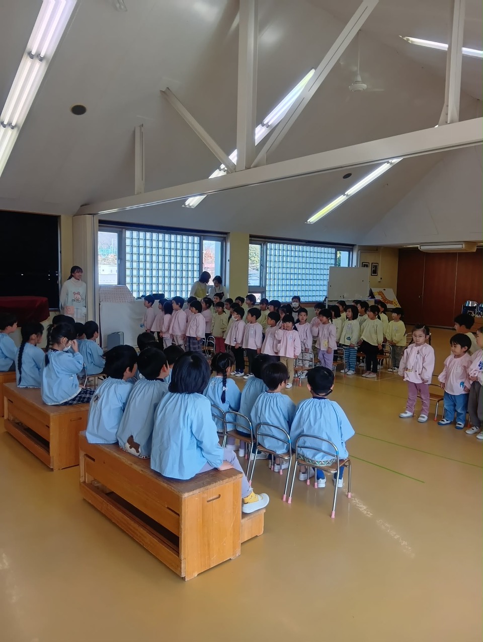 年少さんと年中さんが集まったホールに、年長さんを招いてみんなで卒園の近づく年長児さんを送り出す心の準備をしました。