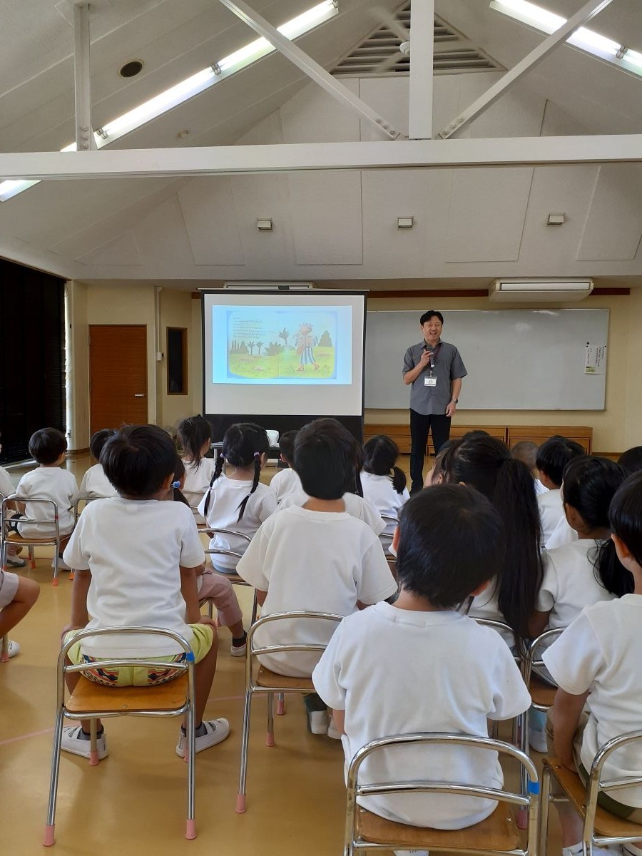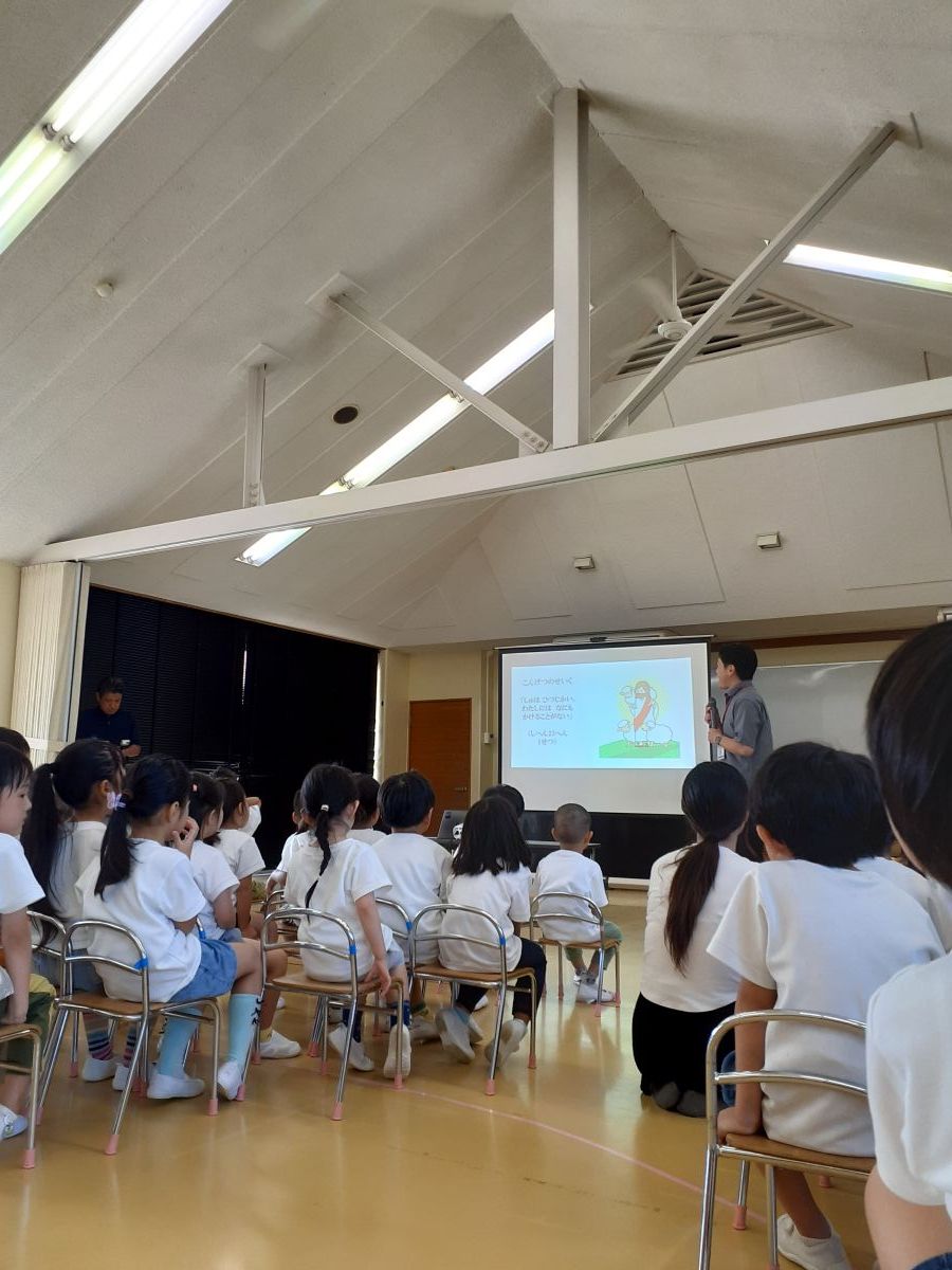 今回は、9月の暗唱聖句「主は羊飼い、わたしには何も欠けることがない」から、一匹の迷い出た羊の絵本を読みながらのお話です。子どもたちはそれぞれ真剣に話をきいていました。そして最後に、「みなさんは、とっても大切な存在なんですよ」との園児たちへの語りかけでお話が閉じられました。
