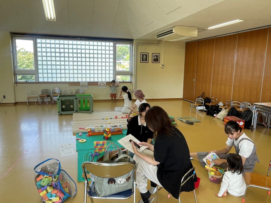 後ろでは保育学専攻の学生ボランティアが小さな子どもたちを見てくれます