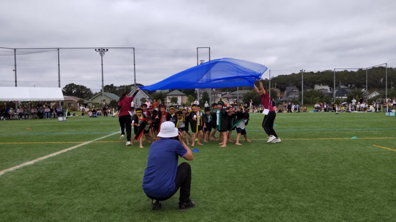 次に、年中児です。種目「25ひきのこぶたの大大冒険」では、素敵なダンスの後に、パラシュートとという大きな布を使った全体の創作ダンスが行われました。一枚の布をみんなで協力しながらクラゲにしたり、とっても素敵でした。