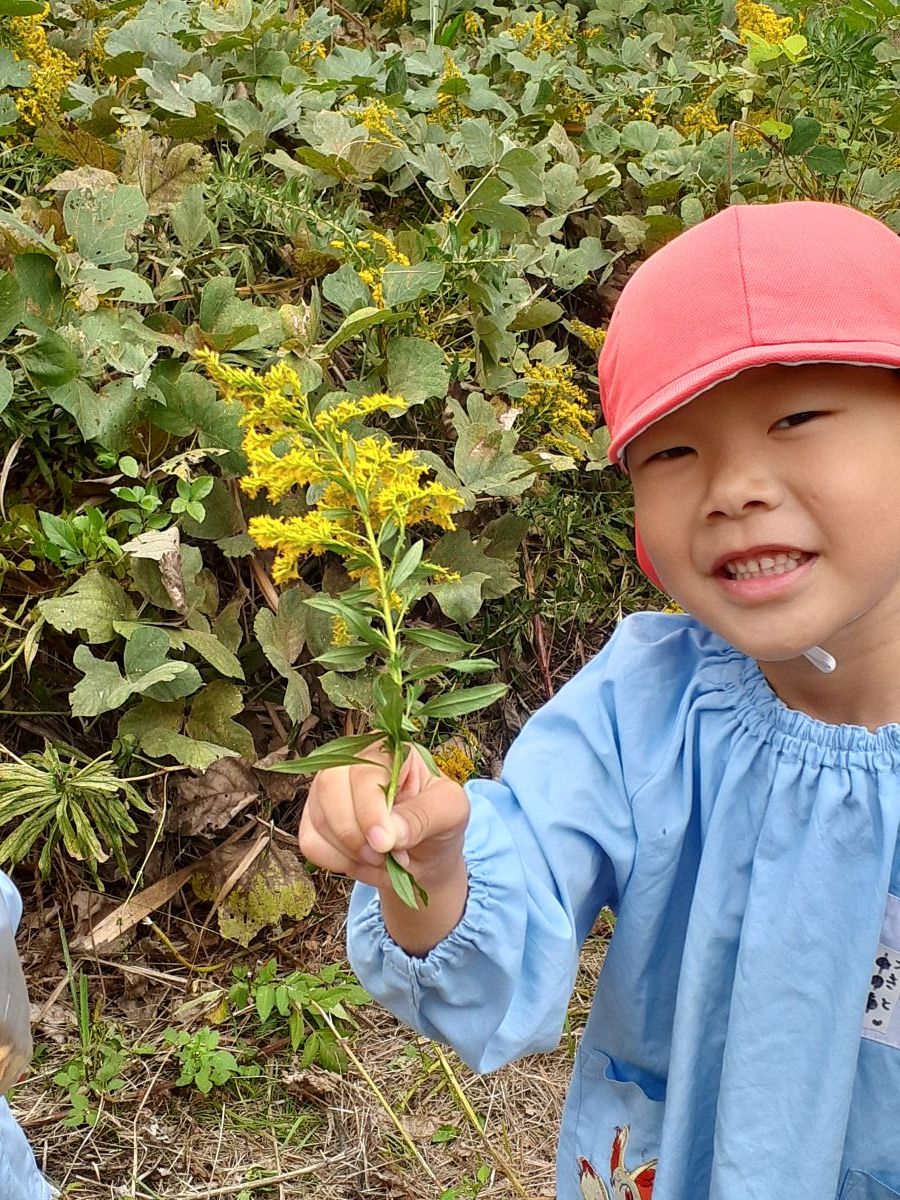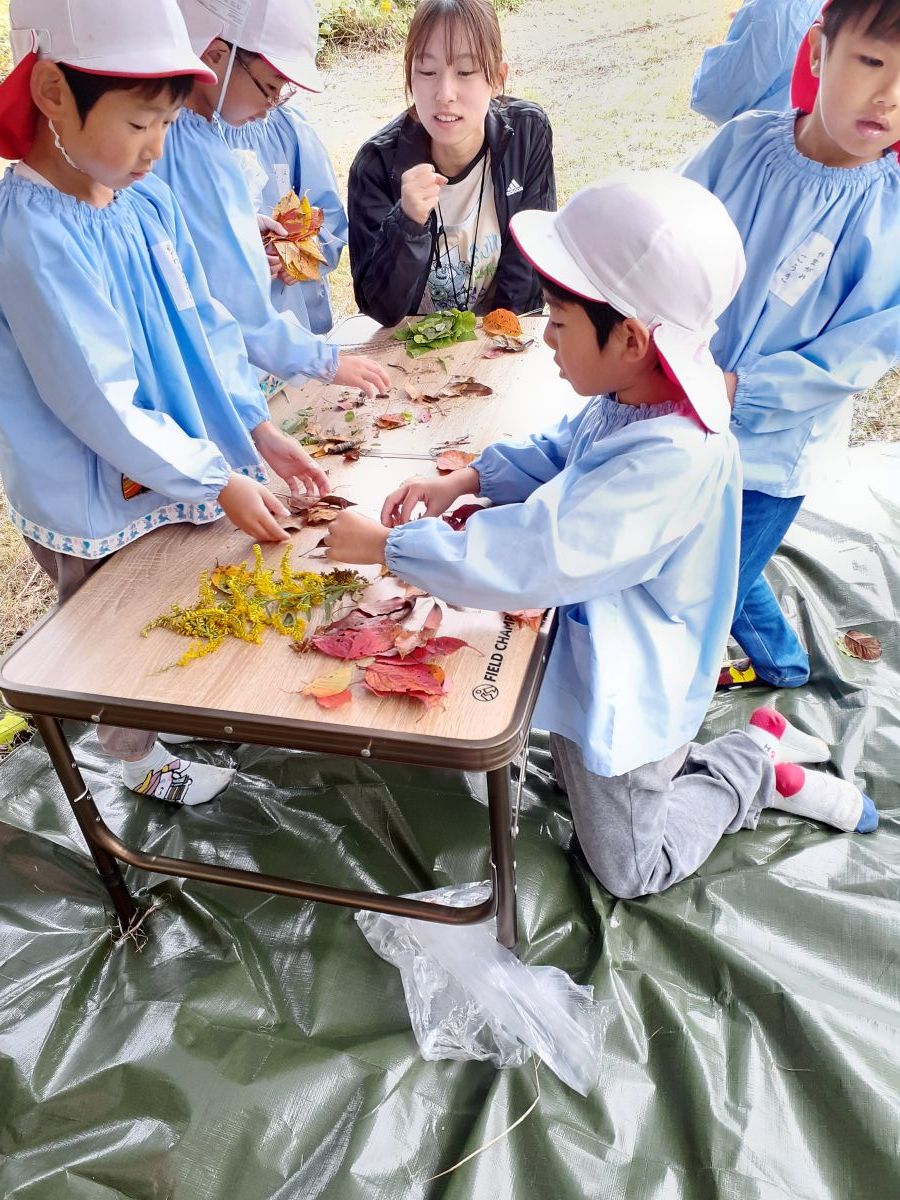 23日は小山田緑地に遠足に行き、園児たちはそこで自然の形を見つけ、たくさんの写真を撮りました。そして24日には幼稚園裏の「おやま」にて探究活動です。そこでは広大な自然空間で自然物を見つけては採取し、後で各グループごとに分類作業を行いました。「おやま」を舞台にただ遊ぶことも楽しいのですが、今回のように探究の目的があり、またグループでの作業にすると、「なぜ葉っぱは色が変わるのかな」「命の順番で色がちがうんだよ」など相互に学び合いながら探究する姿が見られました。分類をするという作業が入るので、色や形、どんな特徴で分けていくのか、各グループの違いがとっても新鮮でした。