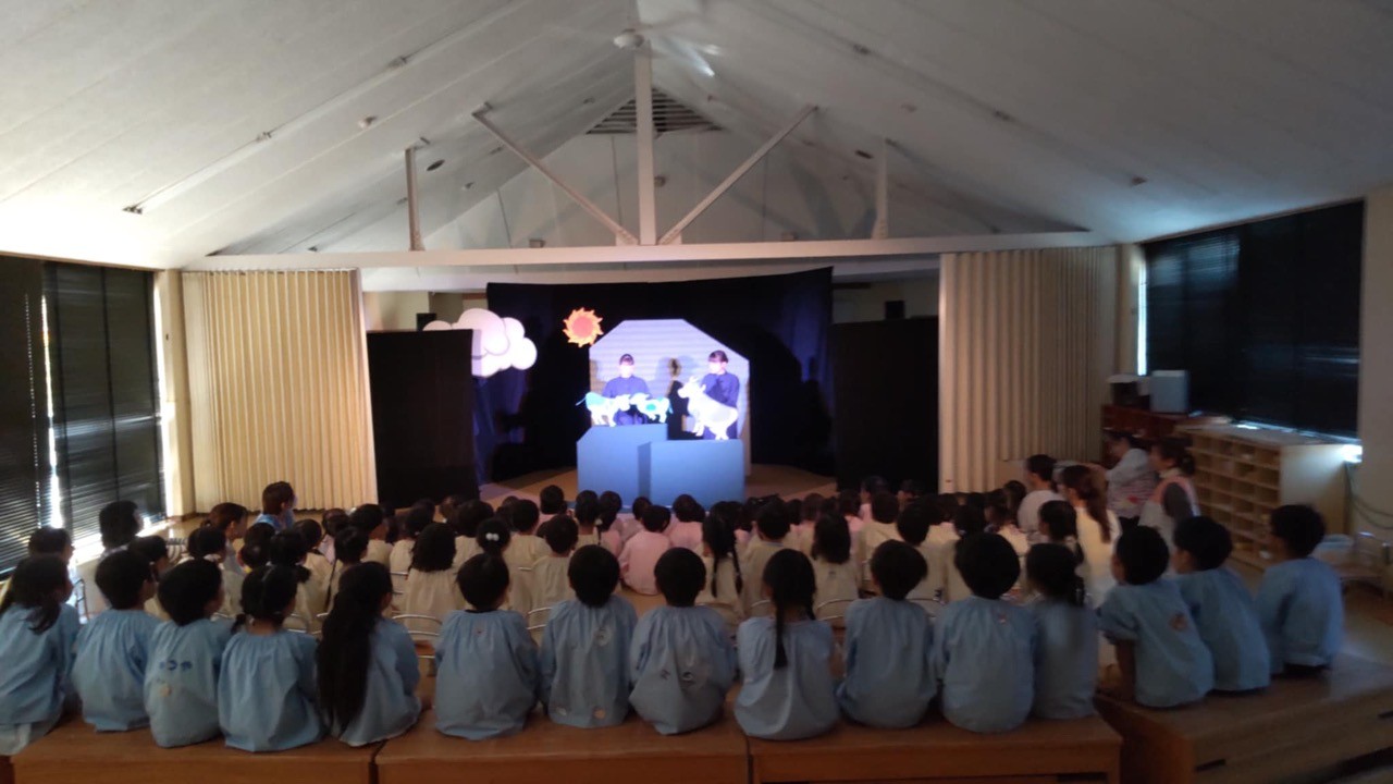毎年、幼稚園ではこの時期にプーク劇場さんにお越しいただき、クオリティーの高い観劇をさせてもらっています。今年は、『ねずみのチョッキ』を上演してくださいました。小さなねずみがお母さんに作ってもらったお気に入りのチョッキ、次々と大きな動物たちに貸し出されていき、伸びきっていくというお話です。