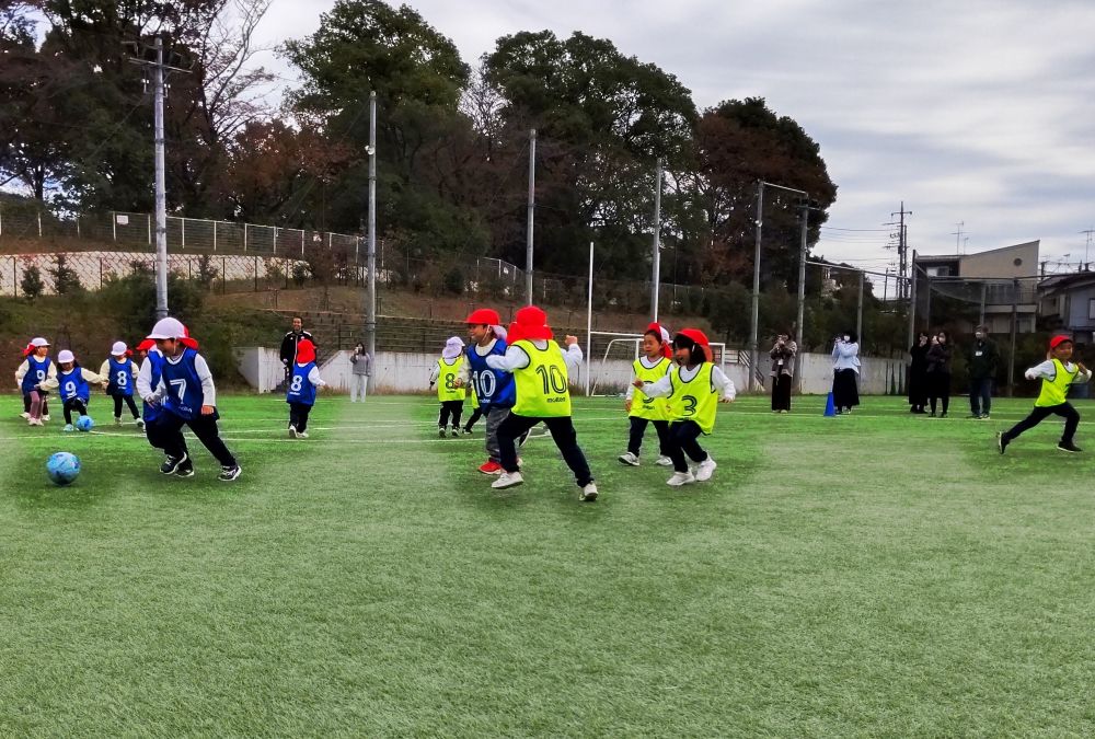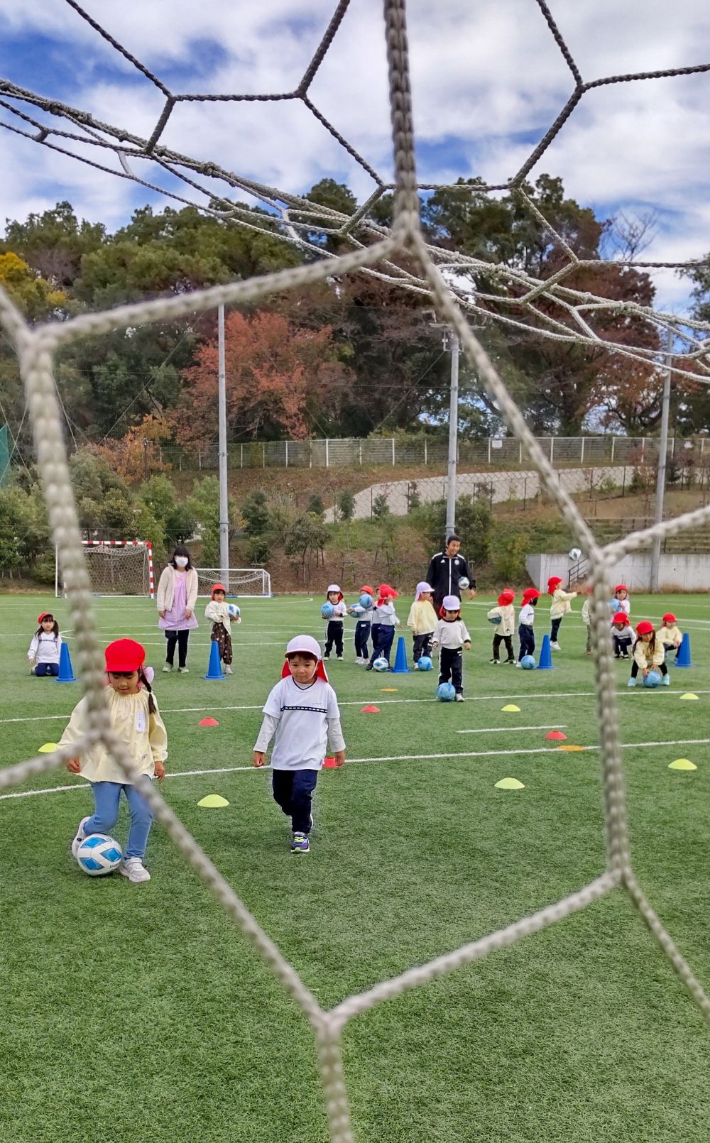 11月の半ばですから、涼しくなったとはいえ、途中何度も休憩・水分補給の時間を取ってくださいました。最後はブルーチームとイエローチームに分かれて練習試合。途中、ボールが2個、3個とどんどん増えていき、子どもたちが複数のボールを追いかける見逃せない試合展開。楽しく、思いっきり身体を動かした11月でした。