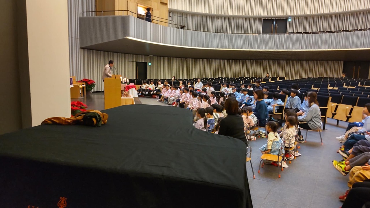 12月3日、幼稚園ではアドヴェント礼拝を守りました。アドヴェントとは、クリスマスまでの約4週間の期間で、イエス様の誕生を待ち望む期間になります。この日は幼稚園ではなく、学園のチャペルで礼拝です。お話は学園チャプレンの土橋先生に、またパイプオルガンの奏楽は音楽主事の藤原さんにご担当いただきました。
