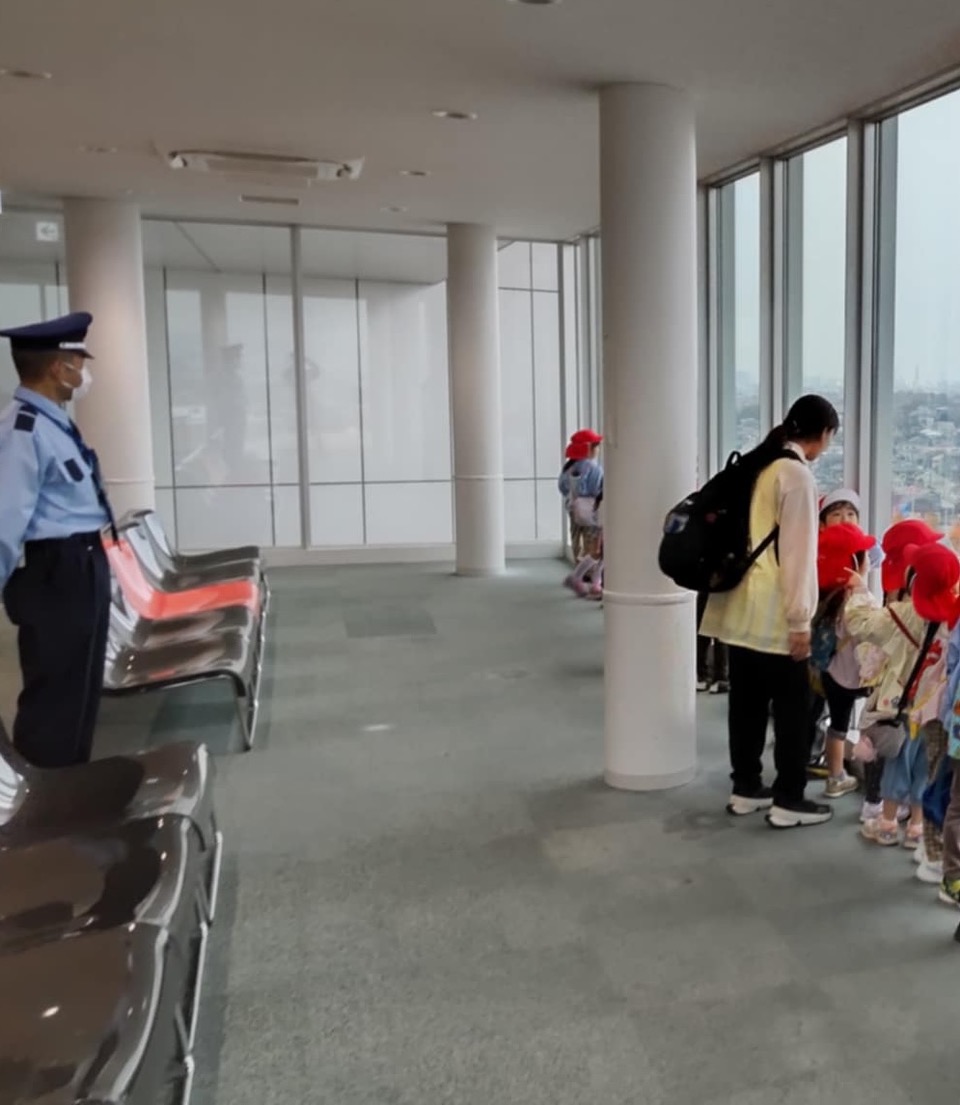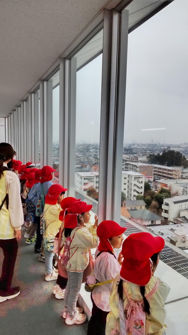 大学の町田キャンパス明々館の8階にあがり、そこから外を眺めました。幼稚園者は2階ですが、それとは異なる眺望に園児たちも興奮です。「あ、あの場所知ってる」「あそこに行ったことがあるよ」などの声が聞かれました。すれ違う大学生も園児たちに優しく接してくれました。警備の方も探索の間、優しい眼差しを園児には向けながら、安全を確保するために一緒に歩いてくださいました。いつも、園舎の方にも見回りに来てくださることを感謝いたします。