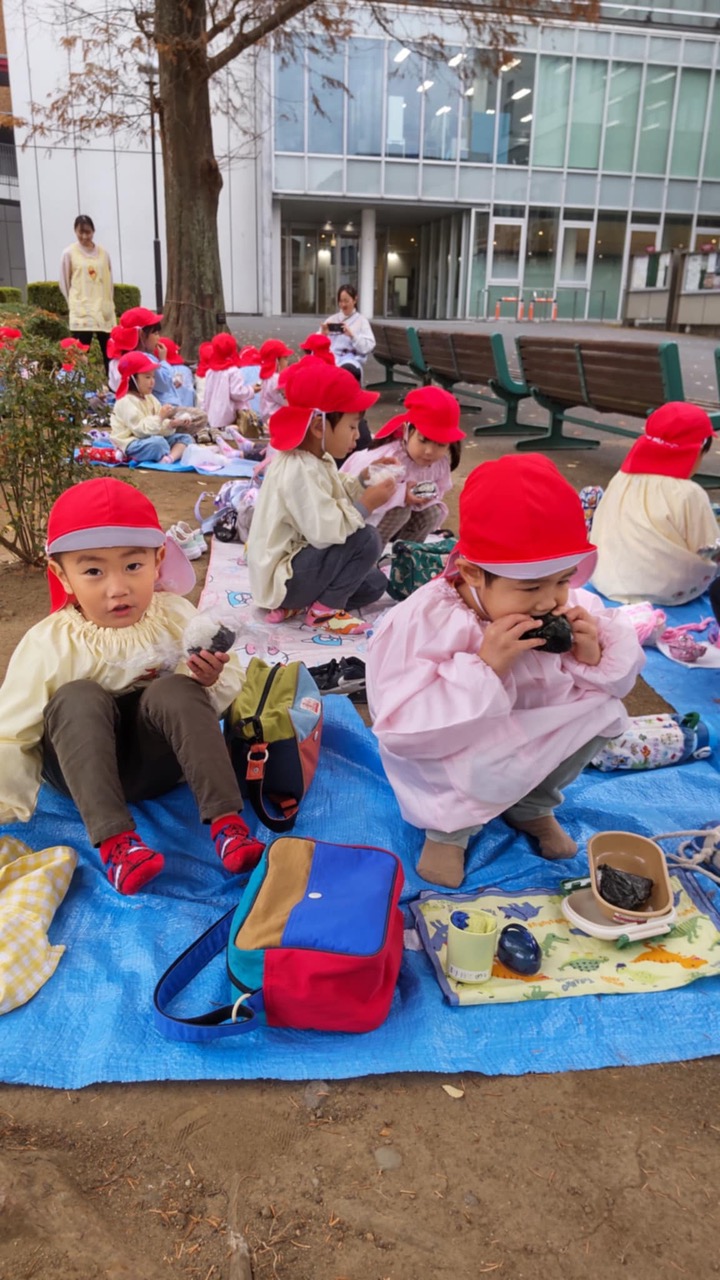 見回り後は、キャンパスで昼食(おにぎり)を食べてから、園舎に戻りました。桜美林幼稚園では、体育の時間では大学の体育館を、運動会やサッカー教室では中高の人工芝のグランドなどを使用させていただいております。これも総合学園の中にある幼稚園の嬉しい一面です。