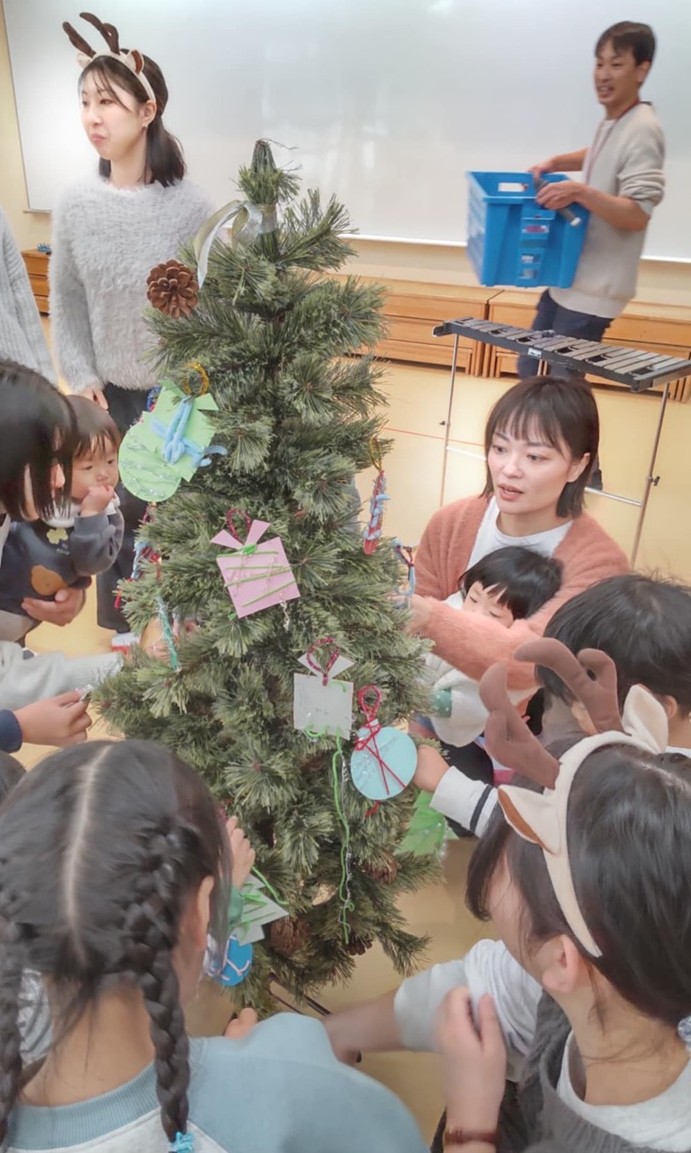 最初の1部は、保育専修の学生さんと教員がクリスマスの歌を披露してくれ、参加者たちを楽しませてくれました。また簡単なオーナメント(クリスマスの飾り)を作りを企画してくれ、完成したものは会場に置かれたツリーに飾り付けです。
