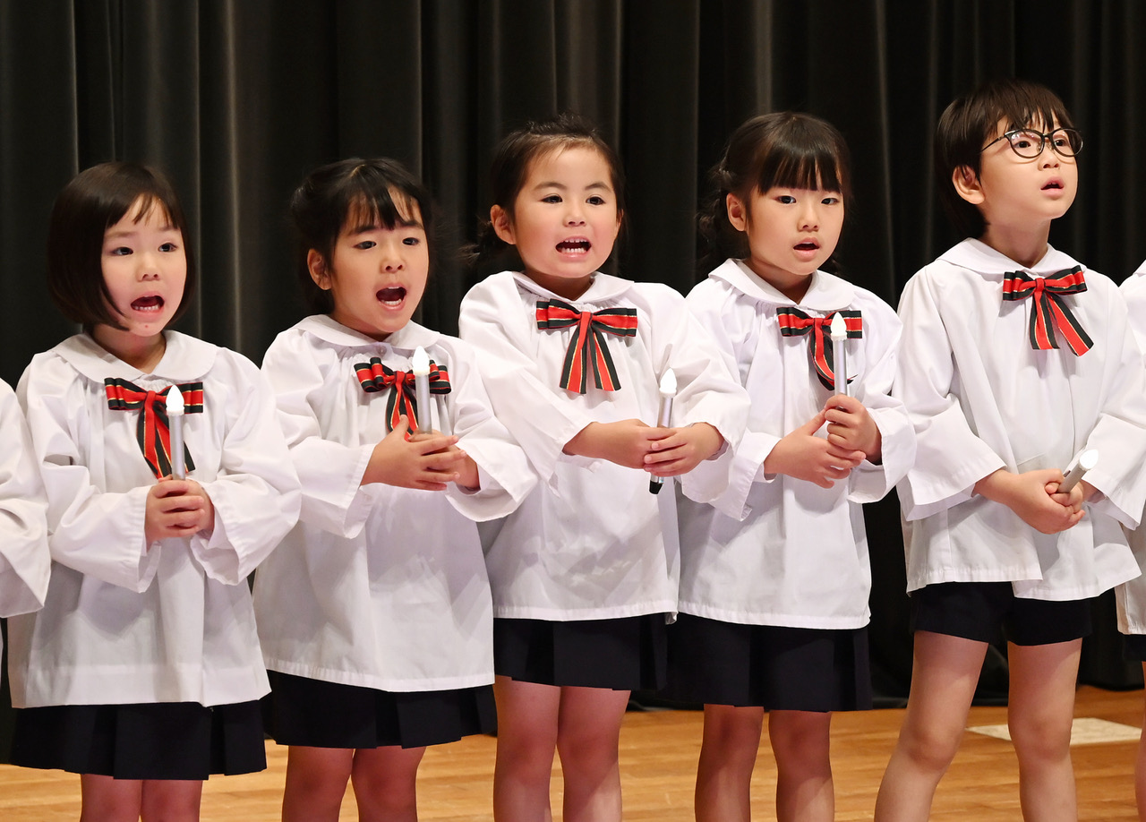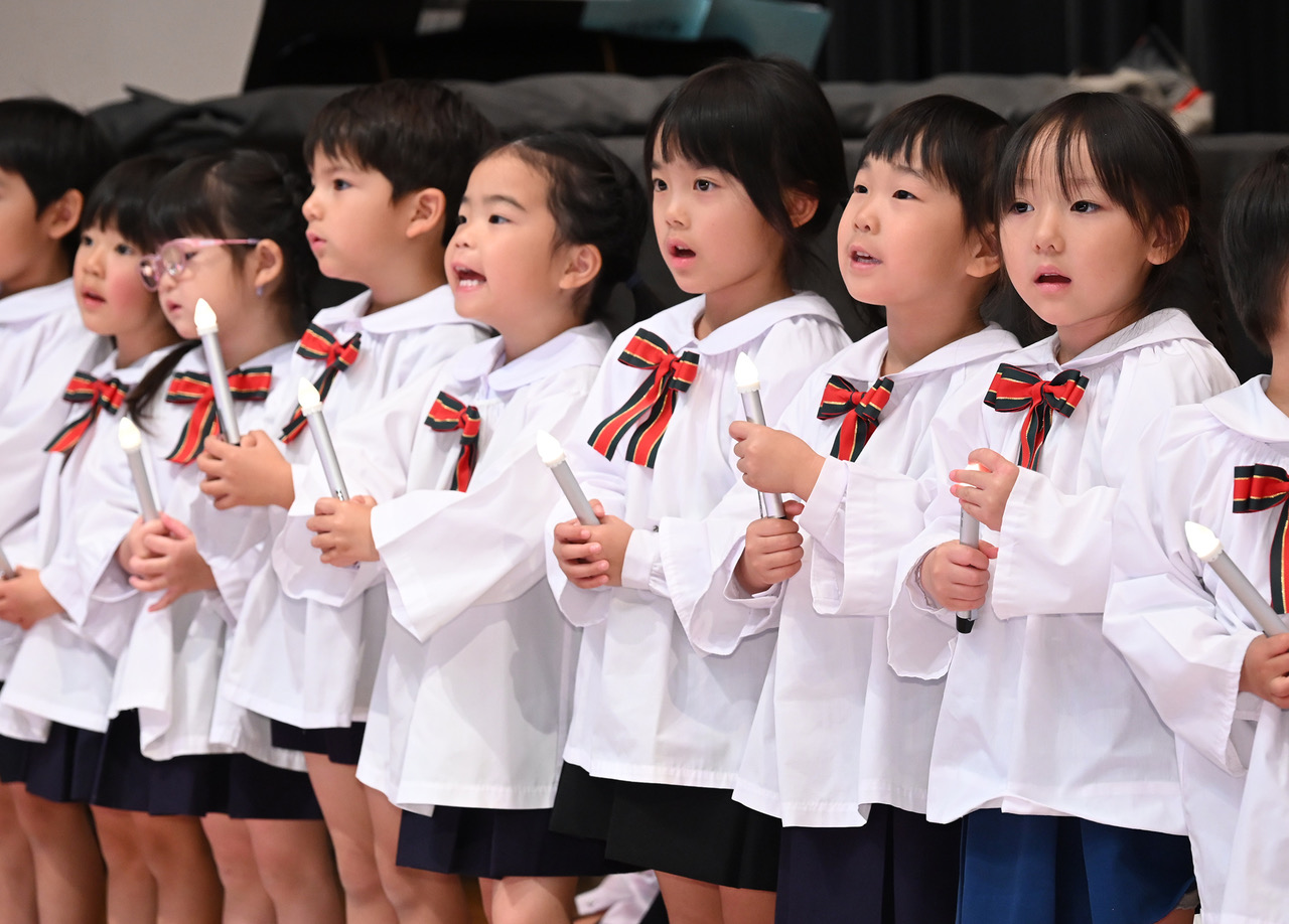 12月12日、幼稚園では大学の施設を使用し、クリスマス燭火礼拝、および聖誕劇の時を持ちました。園児たち、そして教職員総出の行事です。1部は燭火礼拝で、ろうそくの明かりを通して、イエスさまからの「希望」「平和」「愛」「喜び」の炎がその場にいる一人ひとりに、そして世界の光を必要とする人たちに届けられるようにと祈りを捧げました。