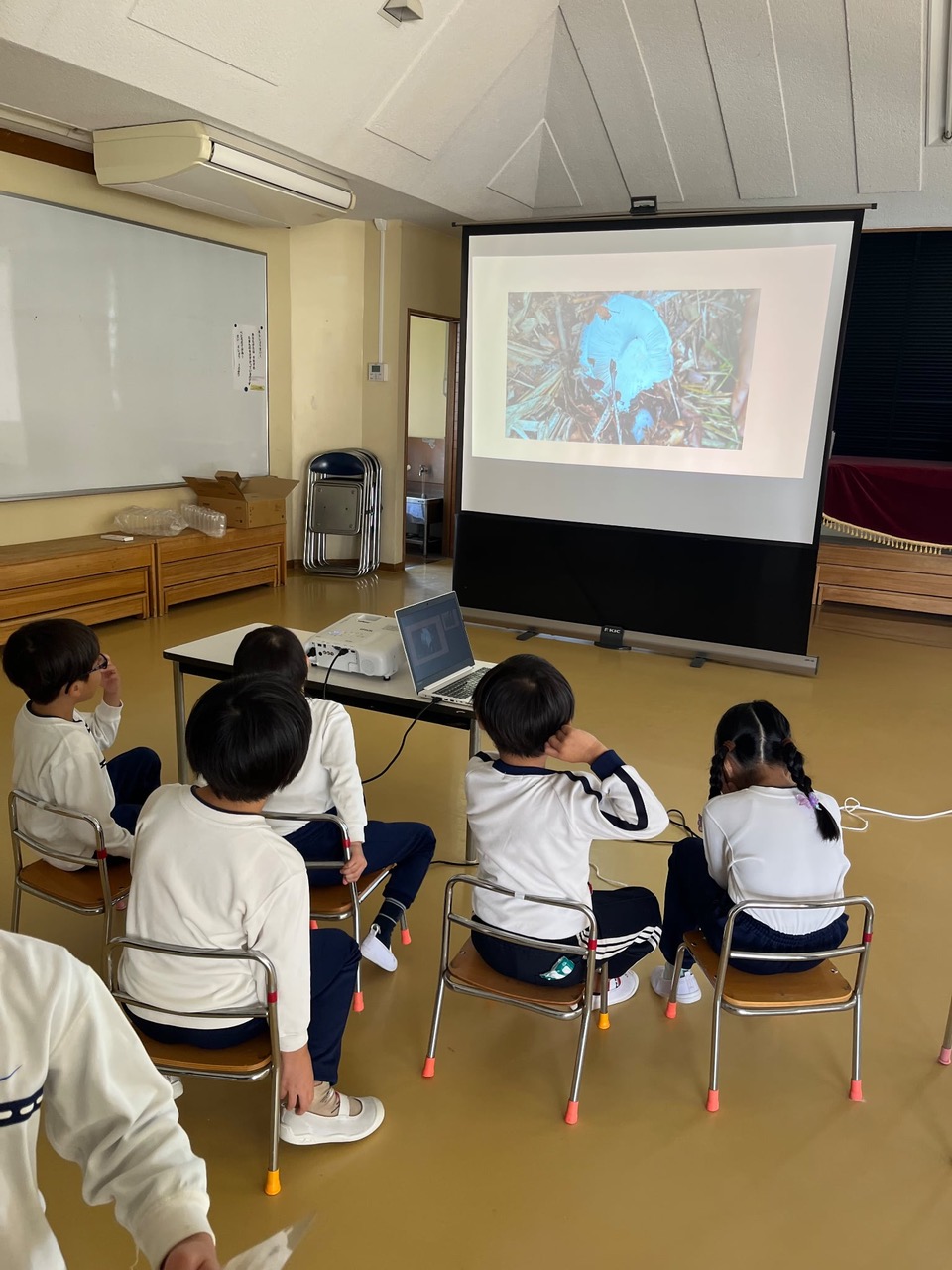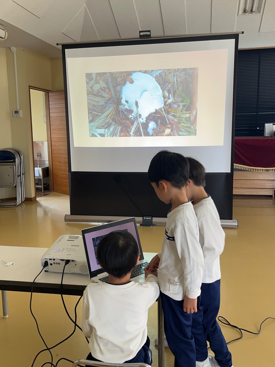 活動場所は幼稚園のホール。そこに3種類の観察ブースを設けました、1つ目は、すでに採集した自然物を写真に取り込み、教員がPowerPointにまとめてパソコンとプロジェクターを繋いでスクリーンに拡大投影し、「どのように見えるか、そして何に似ているか」を観察です。2つ目は、その同じ自然物を虫メガネを使って自分の手と目で観察です。先ほどのプロジェクターの投影との観察の違いを楽しみました。