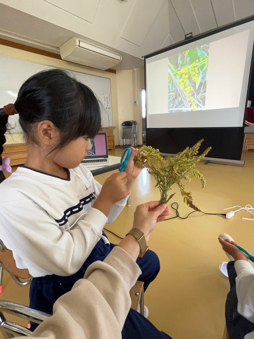 一か月前に採集した自然物をプロジェクターで拡大投影