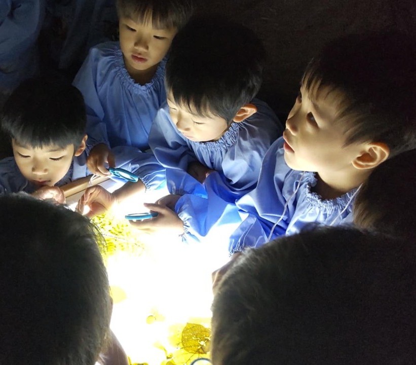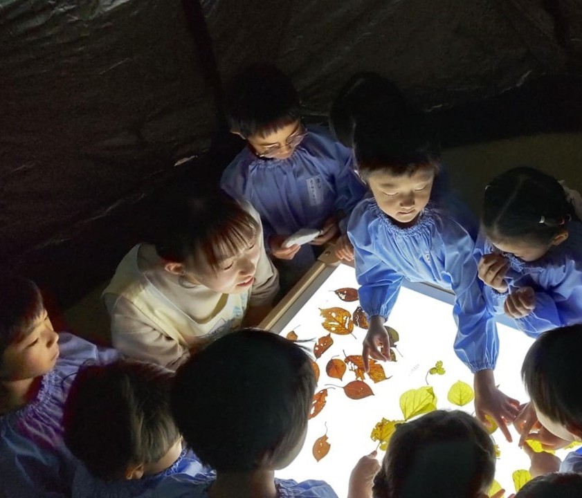 前日に続き、29日も自然物の観察でした。この日は前日とは異なり、「ひかりてーぶる」を異なった環境で使用しました。前日は比較的明るいホールで使用しましたが、今回はテーブルをドームテントの中に設置し、比較的暗い中での観察です。子どもたちはまるで秘密基地に入るような感覚でドキドキワクワク、でも観察は真剣そのものでした。写真の表情から、子どもたちの探究する姿を見ていただけると思います。