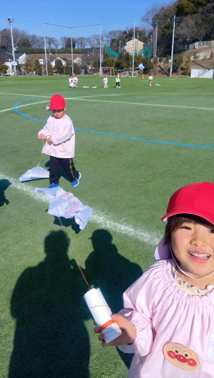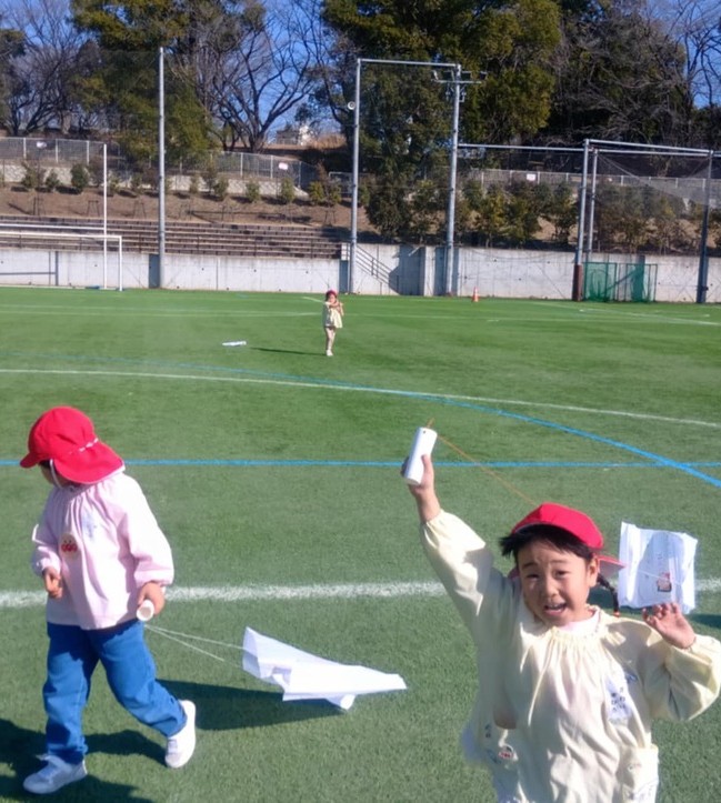 園児たちは、それぞれのクラスで自分の凧を作ります。その凧たちは、自分で絵や色を塗られた唯一無二の凧です。そして自分の凧を持って走り回っては、風をつかもうと一生懸命です。中には、風をうまく捉えて寝転びながら凧揚げができる年長児も。なかなかの強者です。