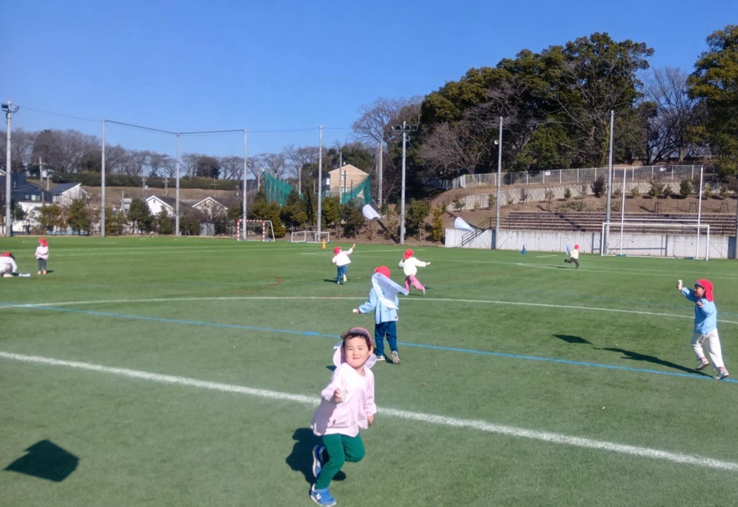 この時期、数日にわたって中高の人工芝の広いグラウンドをお借りして、凧揚げが行われます。最初は先週末の金曜日16日でした。このグラウンドは転んでも痛くありません。