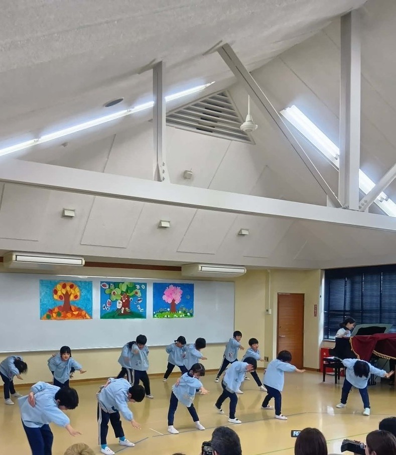 「春」「夏」「秋」と慣れ親しんだ「おやま」の制作物を掲げながら、園児たちは振付ありの合唱に乗せて想い出を発表してくれました。この1年間の一連の活動のつながりを感じるひと時、そして何よりも卒園が近づく年長児の豊かな成長を感じることができた瞬間でした。