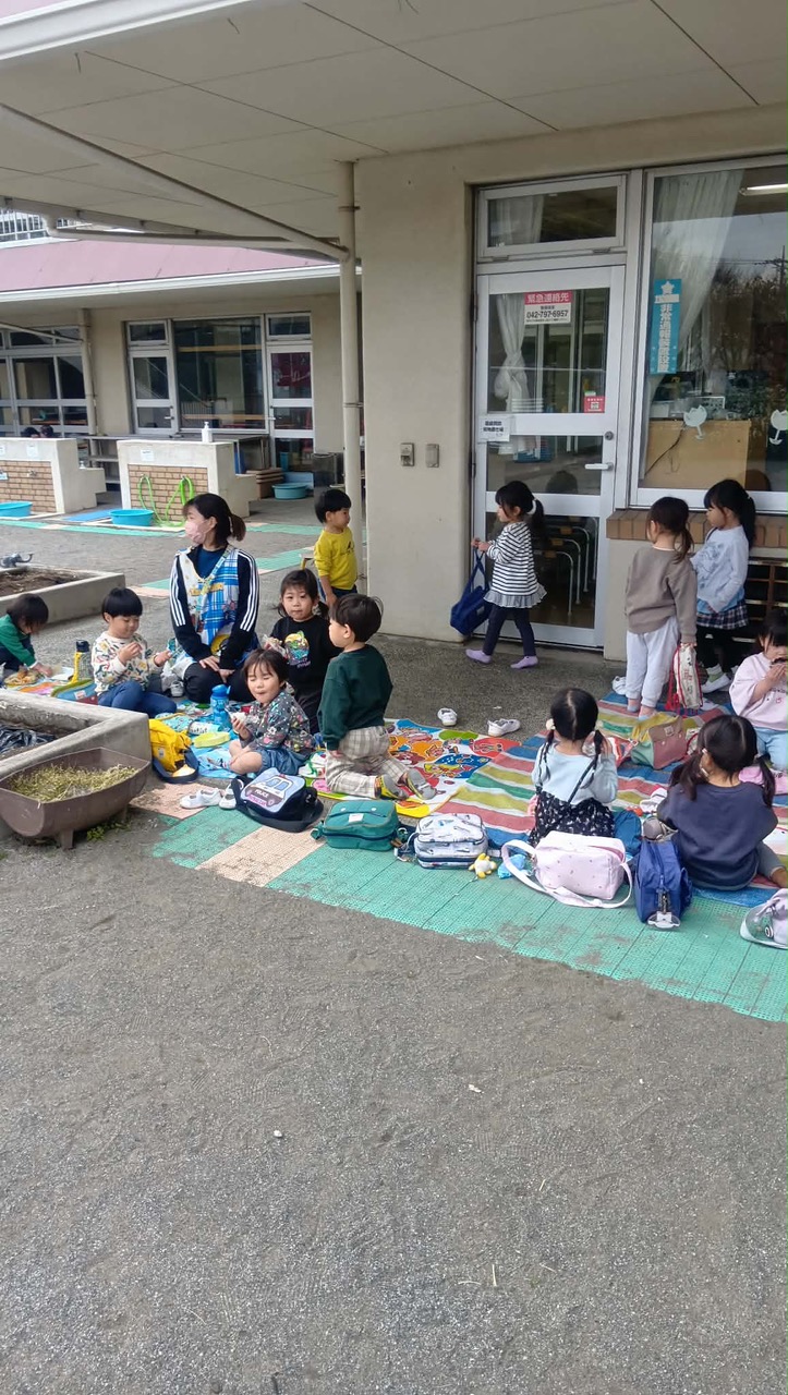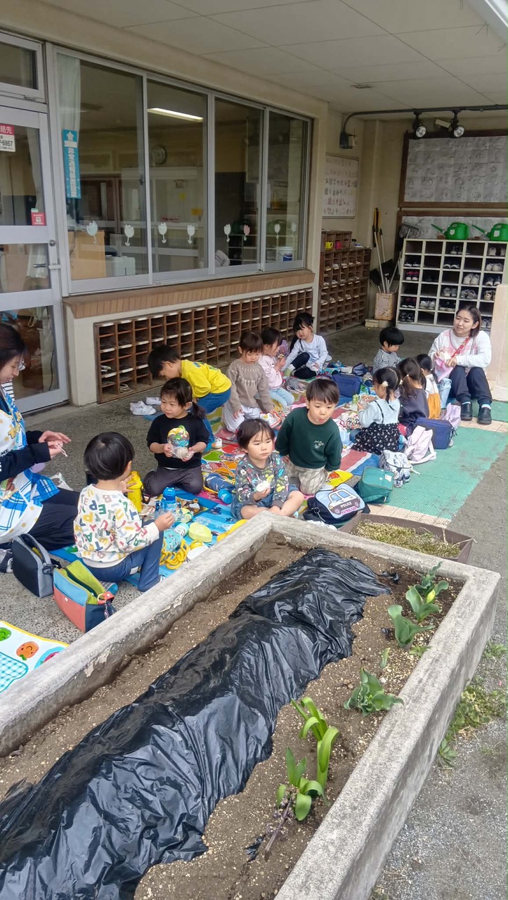 写真は、3月後半に縦割りクラスのお兄さん・お姉さんが園外に保育に出かけた時に、「ひかり組」さんのお友達も園庭で昼食を守った時のものです。園長先生の「おそとで食べると美味しいですか?」との問いかけに、うれしそうにみなさん「おいしい!」と応えている様子が印象的でした。みんなで食べるご飯は美味しいですね。